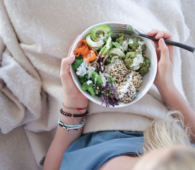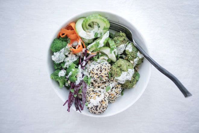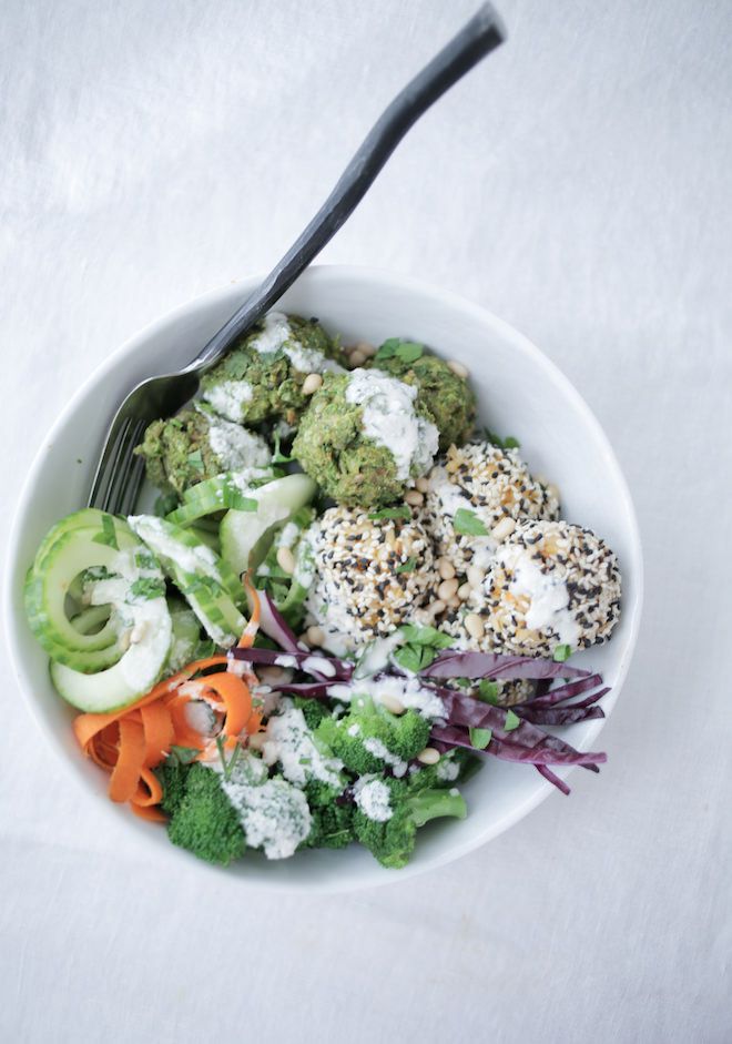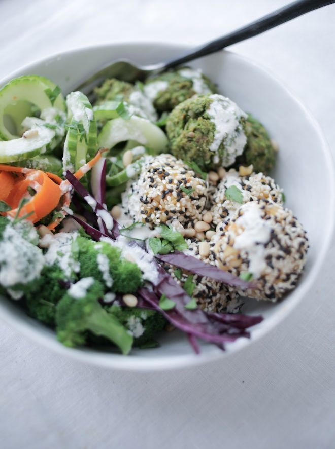 - To serve, place falafel and rice balls into a bowl of your favorite steamed greens (like collard, kale, spinach, etc.), steamed veggies like carrots, zucchini squash, with avocado, a drizzle of tahini or cashew cream, a splash of nama shoyu, etc.