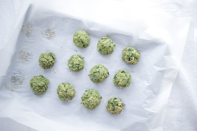 - Using your hands, form 18 small round falafels and place on a lined baking sheet (I use parchment paper).