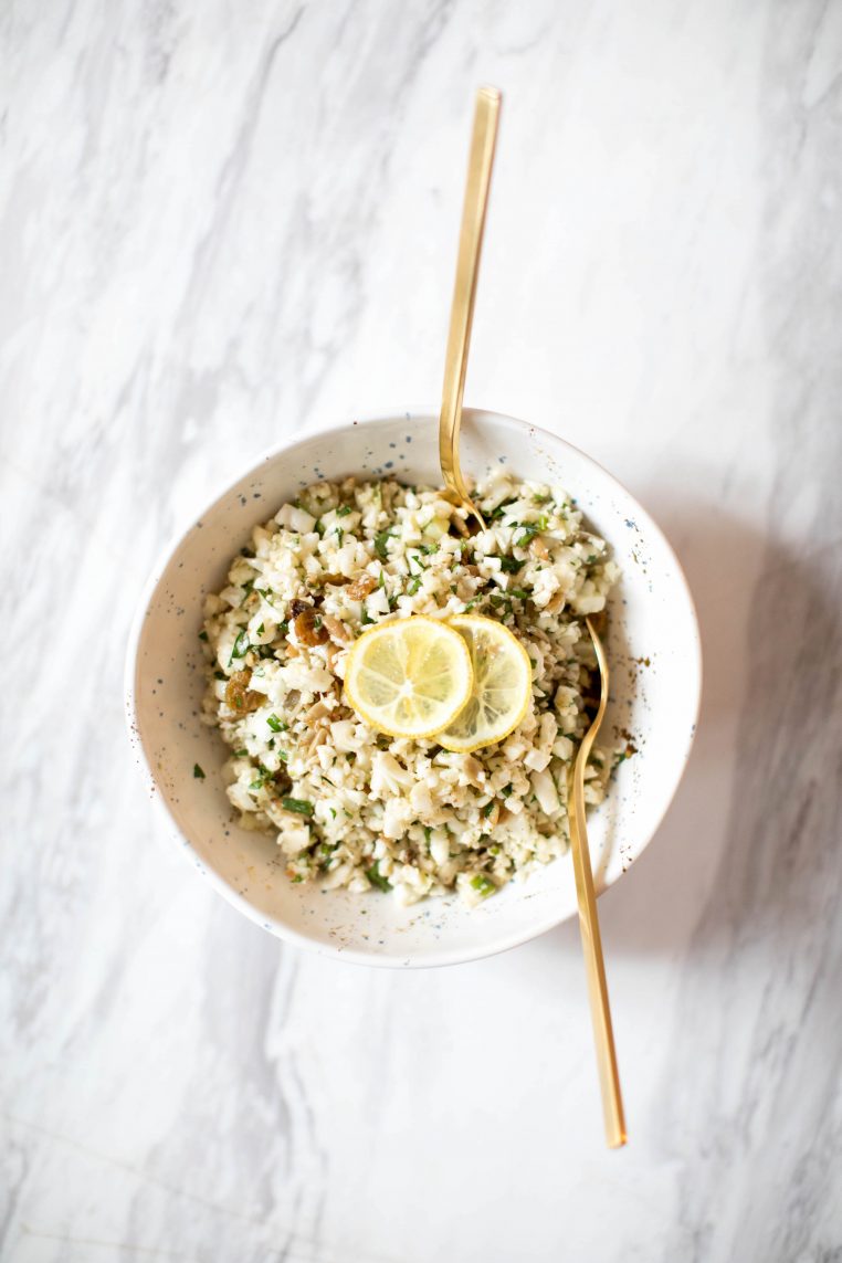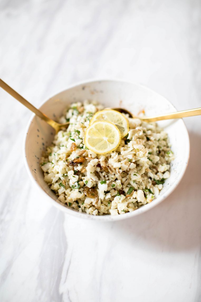 I loved it and would eat it by the spoonful. Fast forward to adulthood and my taste preferences have changed coupled with my expertise in nutrition so I’ve come up with a way to enjoy the concept of this salad but I put a spin on it using just cauliflower and a mayo-free dressing.