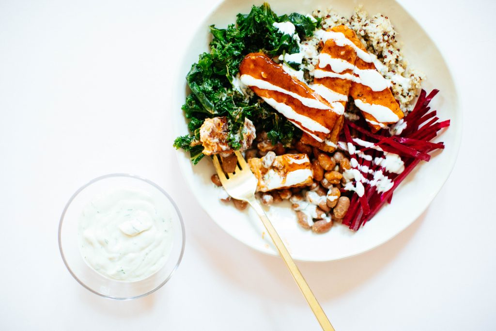 Spice up your next meal with this Buffalo Tempeh Nourish Bowl with creamy cooling vegan Cashew Ranch Dressing.