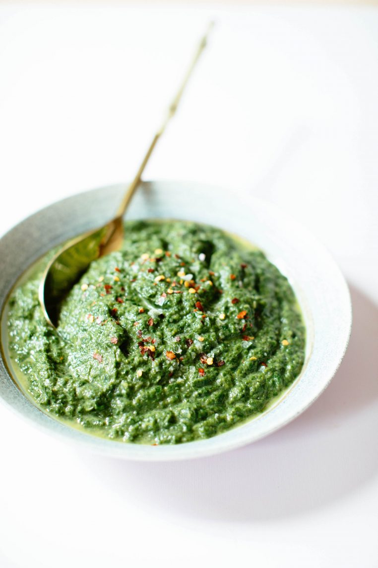 For this dish, you’ll puree cauliflower and spinach together to get a deliciously creamy texture without having to use heavy cream and large portions of butter which are closer to the traditional creamed spinach recipe.