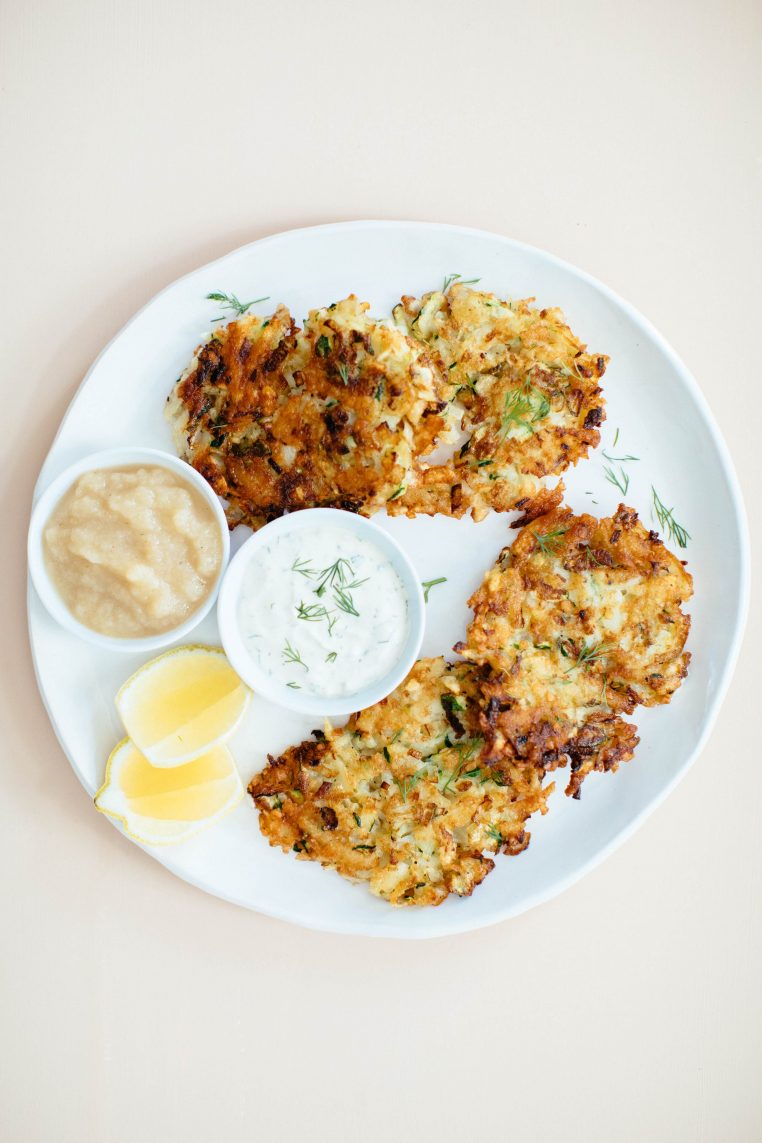 These Crispy Zucchini Potato Pancakes and apple sauce or the perfect pair, but we like to spice things up by cooling it down with our favorite plant-based cashew ranch dipping sauce.