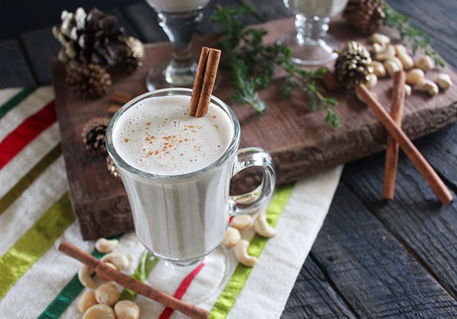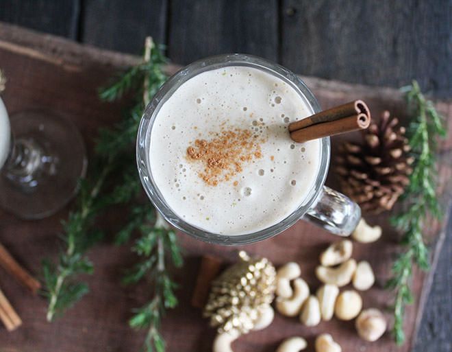 It was important for to keep the great qualities of eggnog and make it completely dairy free (vegan friendly) and lower in calories, sugar, fat, and alcohol in comparison to traditionally made eggnog. I do this by making the base out of cashews and macadamia nuts which both make it very thick, frothy, and creamy; then add in dates and stevia to sweeten, and boost the flavor with warming spices of nutmeg, cinnamon, and vanilla. The result is a velvety, frothy, sweet, and spicy eggnog.
