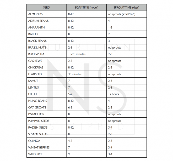 Usse this handy sprouting chart to know exactly how long to soak and sprout different types of foods!
