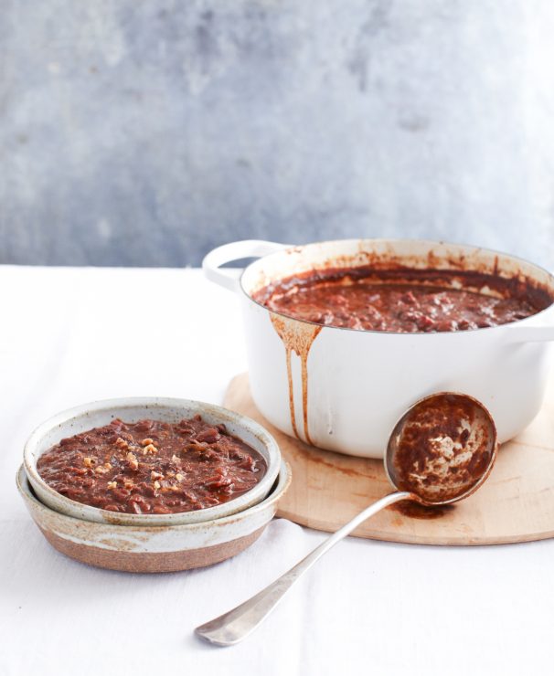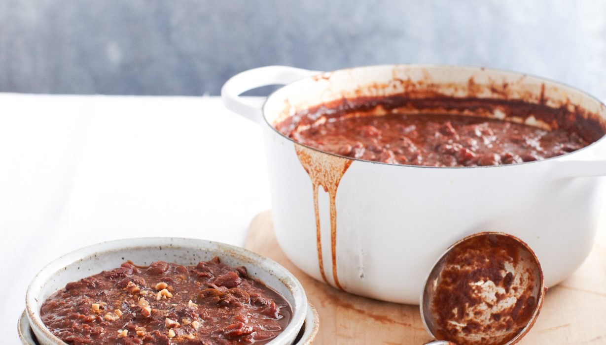 A delicious hearty plant-based Chocolate-Cinnamon Walnut Chili made Cincinnati style.