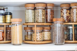 I store nuts and seeds in mason jars to keep things uniform. Mason jars are incredibly affordable, durable and simple. Each set of mason jars easily fits on these wooden lazy susan turntables, which make it easy and fun to store these frequently used foods. Here’s a stainless steel option from Amazon as well.