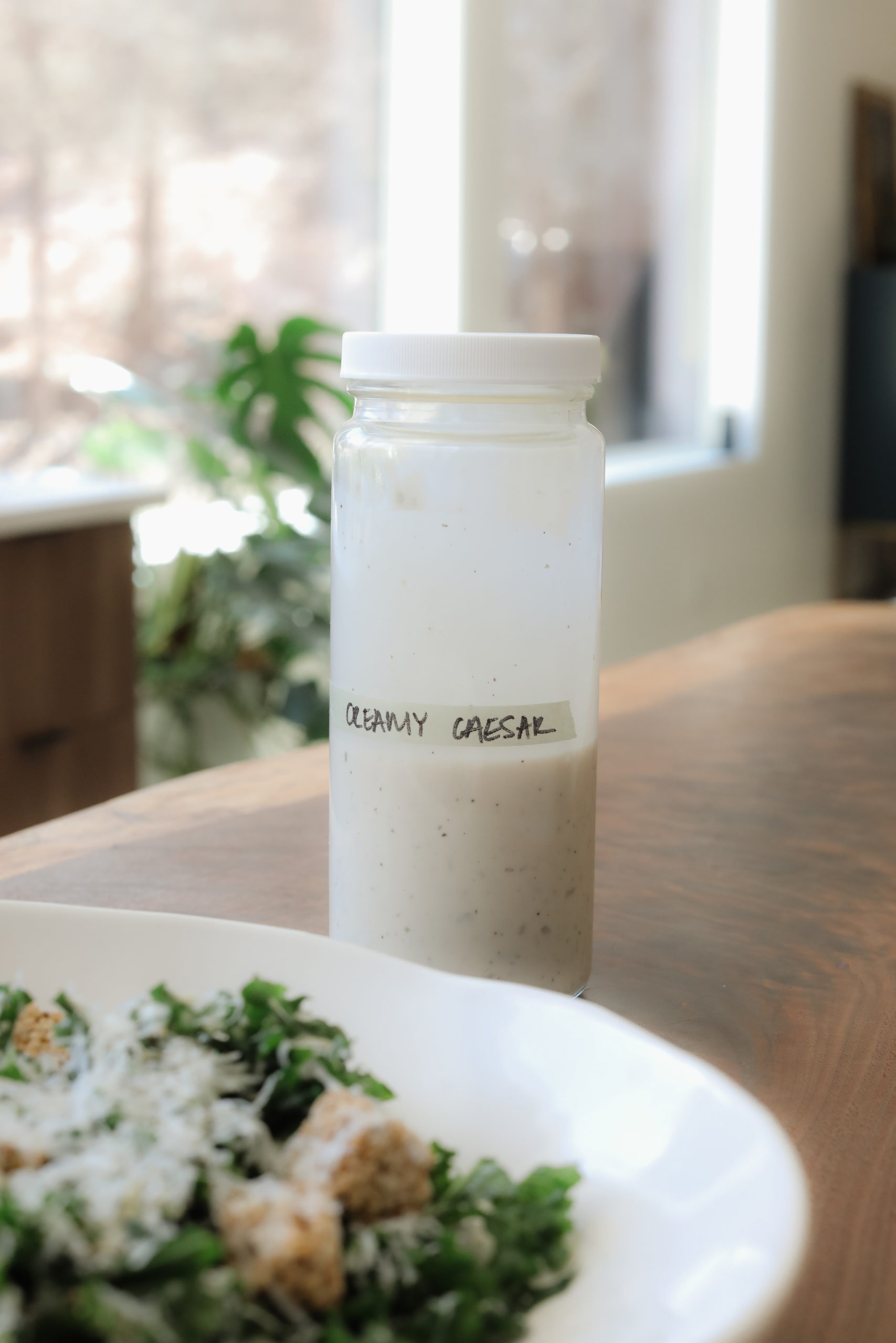 Lastly, combine all of your salad ingredients (except for the dressing) in a large bowl and toss until all ingredients are combined. Once combined, drizzle your creamy caesar dressing over top and combine one last time until the salad is evenly coated!