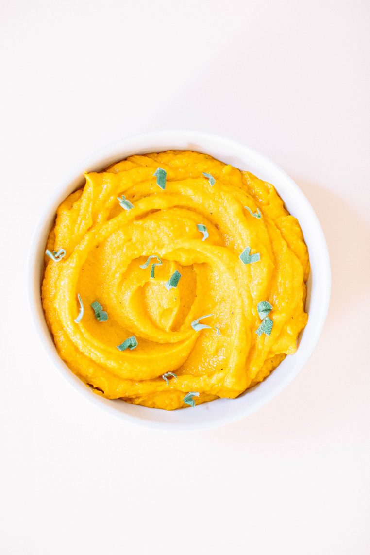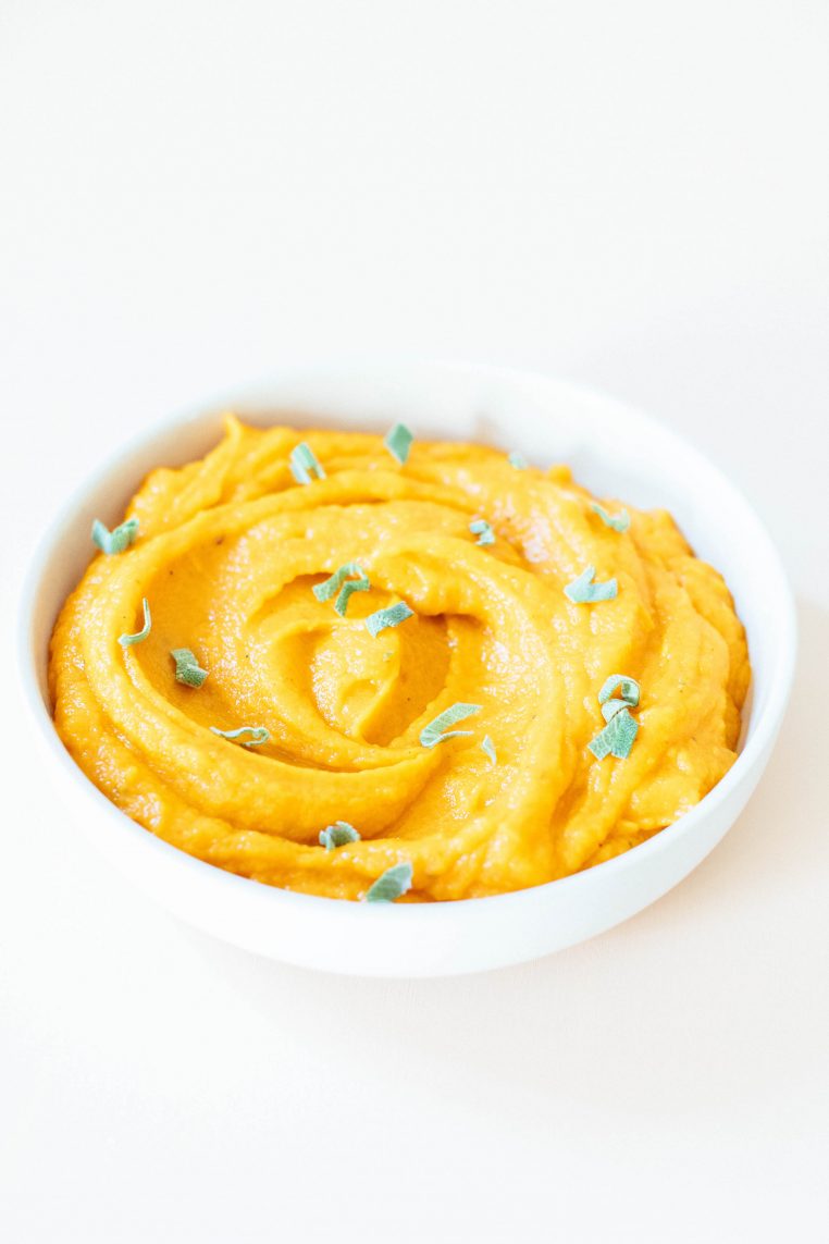 By Roasting the sweet potatoes in the oven, you get smooth and tender potatoes and a caramelized flavor profile you can’t get from boiling. Adding fresh thyme to this dish gives a savory festive fresh taste. Using gluten-free miso adds a rich earthy flavor pairs perfectly with the sweetness of the potatoes.