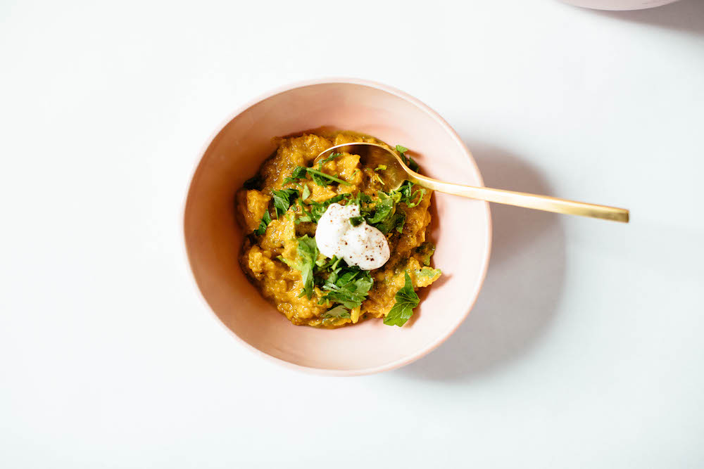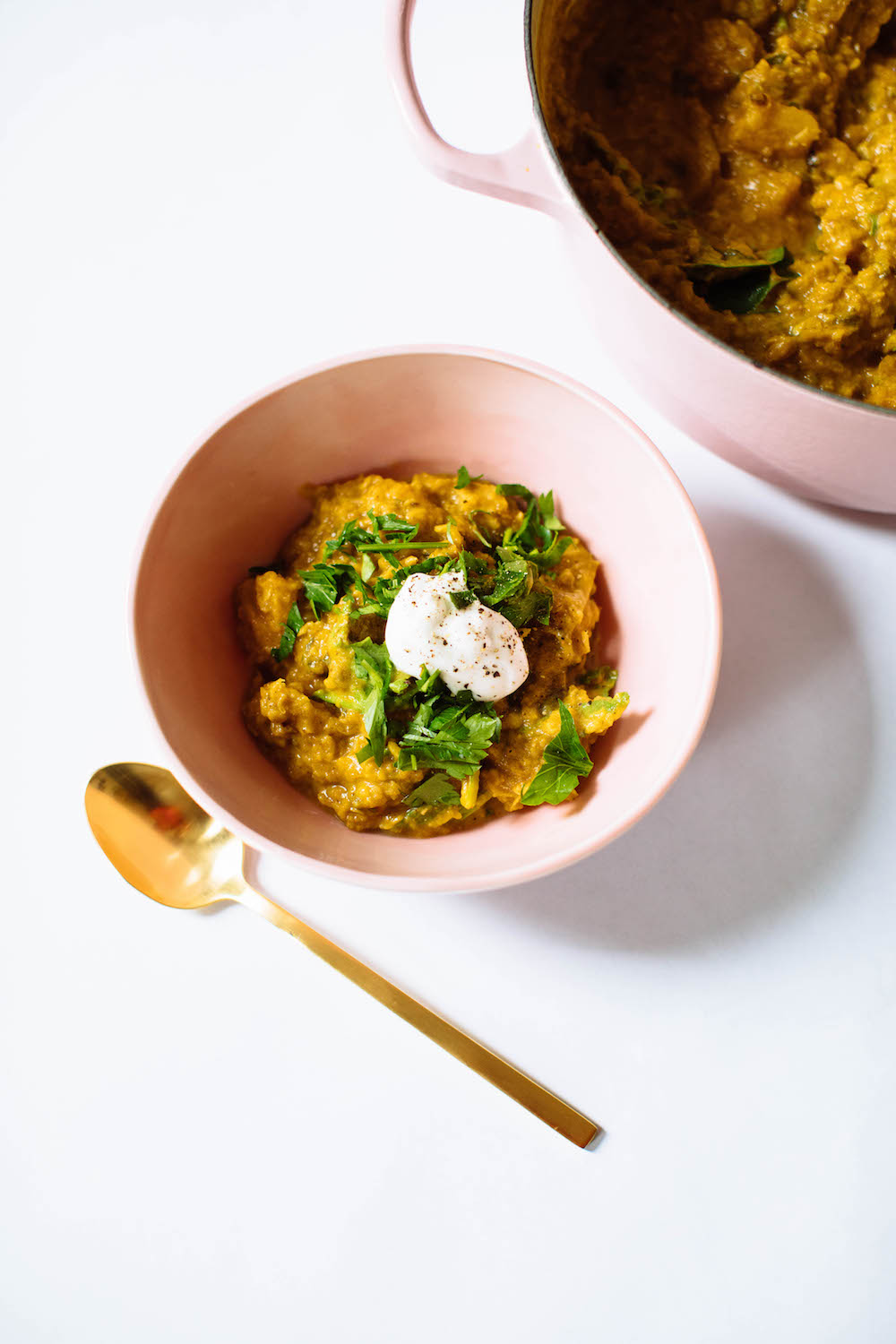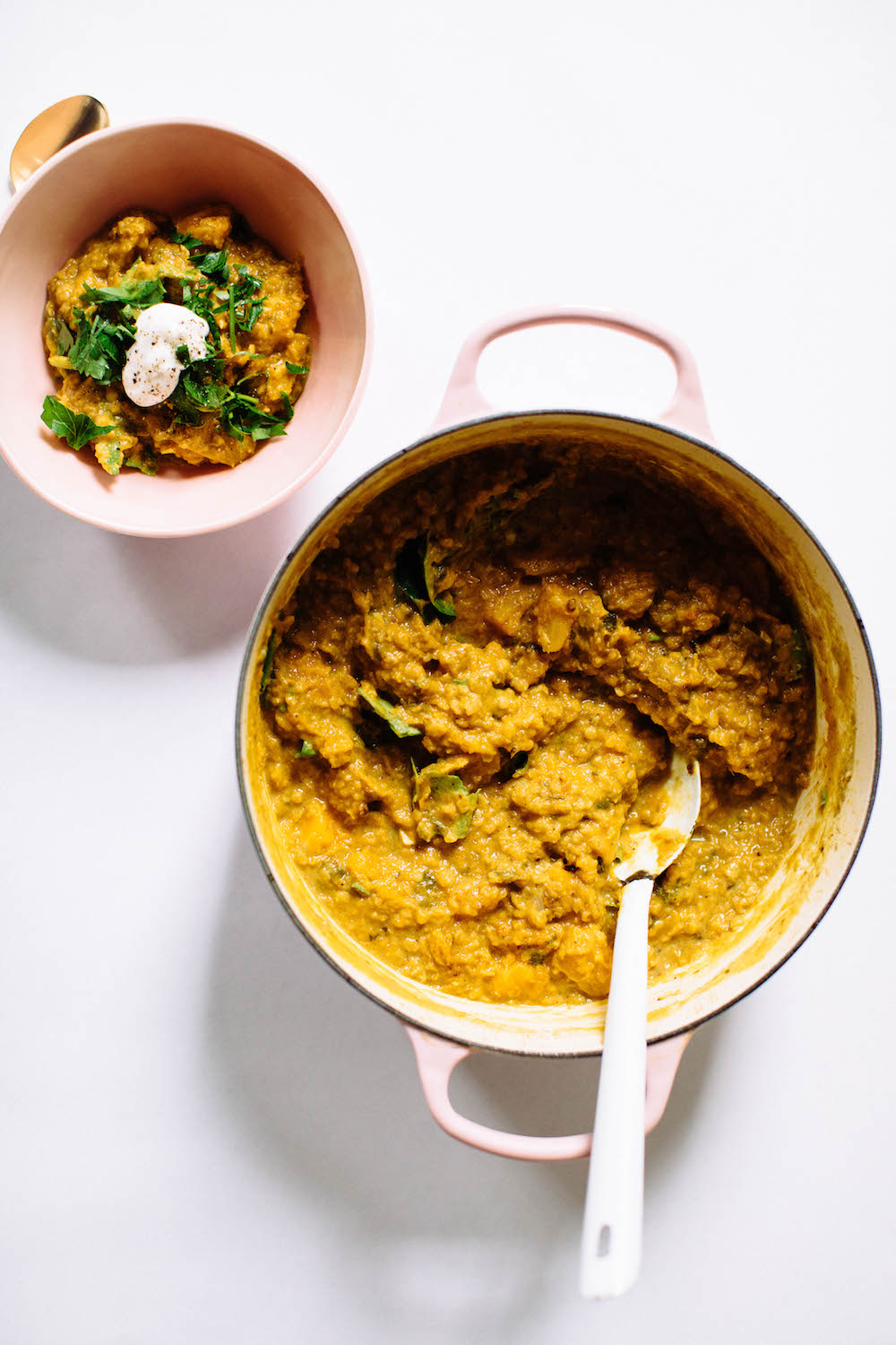 A creamy red lentil daal with acorn and butternut squash, ginger, and coconut milk.