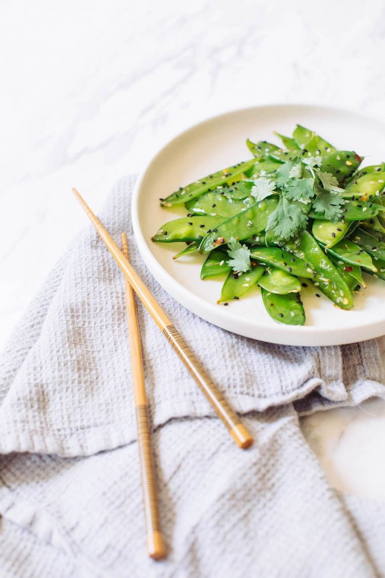 Snow peas, not to be confused with snap peas a.k.a. sugar snap peas, are flat and typically used in stir-fry dishes. They can be eaten whole (including those sometimes pesky strings) or steamed and have a subtle sweet flavor. Sugar snap peas are juicy since they’re larger and contain more water. The peas inside the pod are also used like your standard “green pea” from the garden pea that’s used in cooking. It’s ideal to take off the string on snap peas since it can become very chewy and unpleasant to eat. The snow peas in this recipe are effortless to use and prep and taste amazing with the sesame oil and seeds.