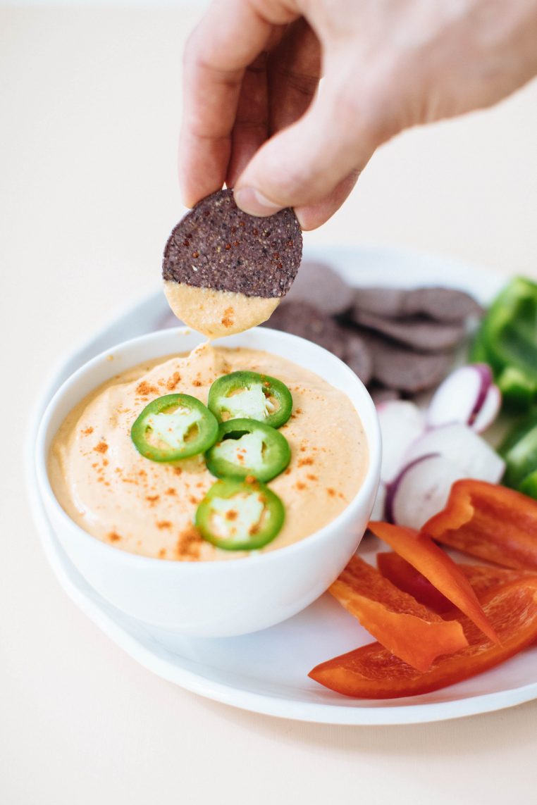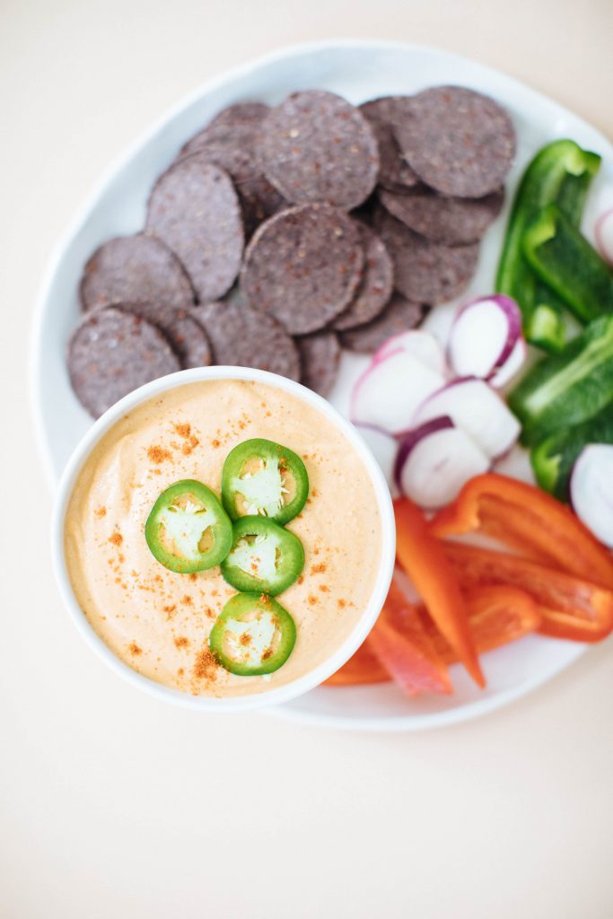With a side of veggies for dipping, this cashew queso dip is a great option for a snack or alongside a meal.