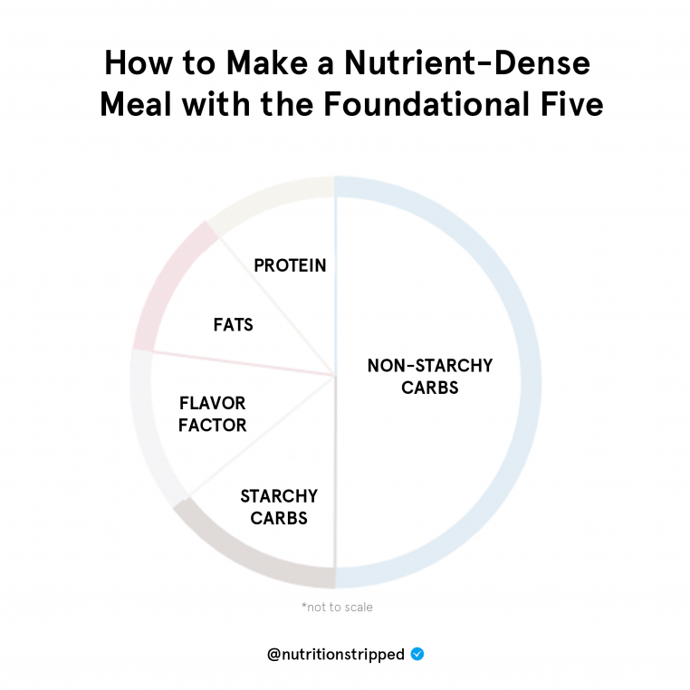 This system is rooted and inspired by nutrition science 101 in balancing macronutrients for health. As Dietitians we’re taught all about the MyPlate and Diabetic Plate Method, both of which provide a guide for how to organize your plate with macronutrients. Our Foundational Five is our spin on the classic model including the Flavor Factor which is unique to Nutrition Stripped.