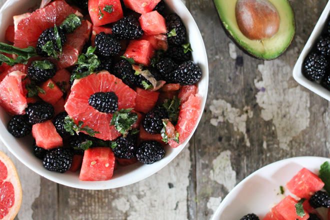 My Watermelon Grapefruit & Blackberry Salad may be a new favorite to bring to your next grill out, backyard parties with friends, or simply to keep around the house for a quick snack or breakfast. Some of my other favorite salads this time of year are the Massaged Kale Salad and Avocado Artichoke Arugula & Spinach Salad.